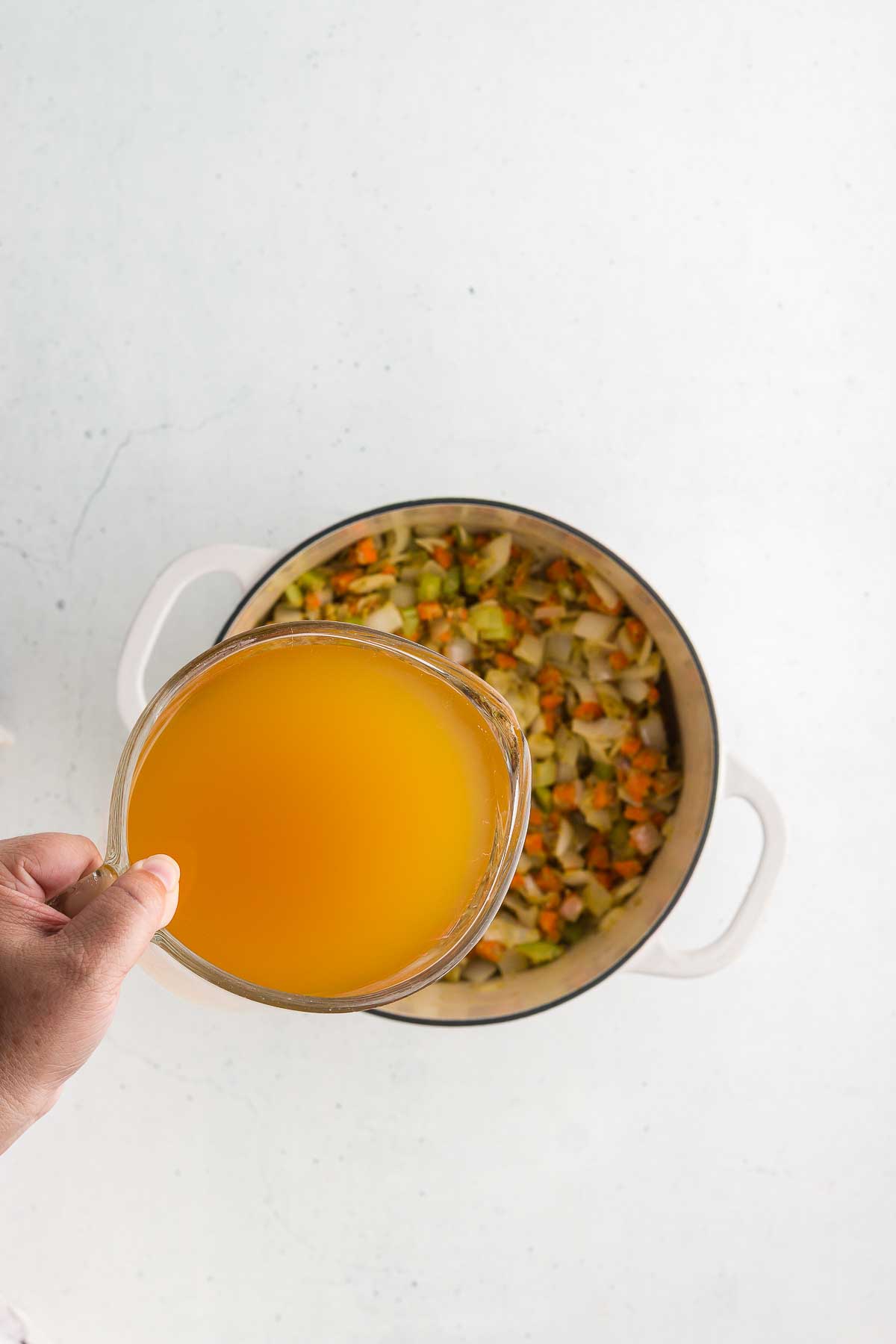 3. Stream in the veggie broth, stirring to pick up any bits that are stuck to the pot.