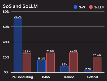 This sector showed the biggest mismatch between Share of Search and Share of LLM. PA Consulting, the strongest in traditional search, ranked only third in AI visibility, while BJSS and Kainos outperformed expectations. The gap exists because LLMs evaluate the substance of content, not the volume of search activity around a brand.