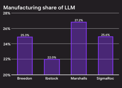 Manufacturing brands were tightly clustered, making this the most competitive category in the analysis. Marshalls emerged as the overall leader with 27.2% Share of LLM, driven by broad and stable performance across a wide range of manufacturing-related themes.
