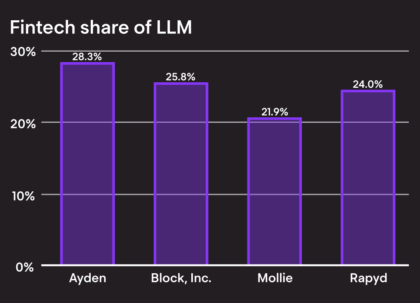 Fintech showed the most predictable results, with Adyen, already the category leader, dominating both Share of Search and Share of LLM. Smaller brands such as Mollie struggled to gain traction, reinforcing a hard truth about LLM ecosystems. If a brand has not yet built authority, AI will not create it on its behalf, although there is still a route in.