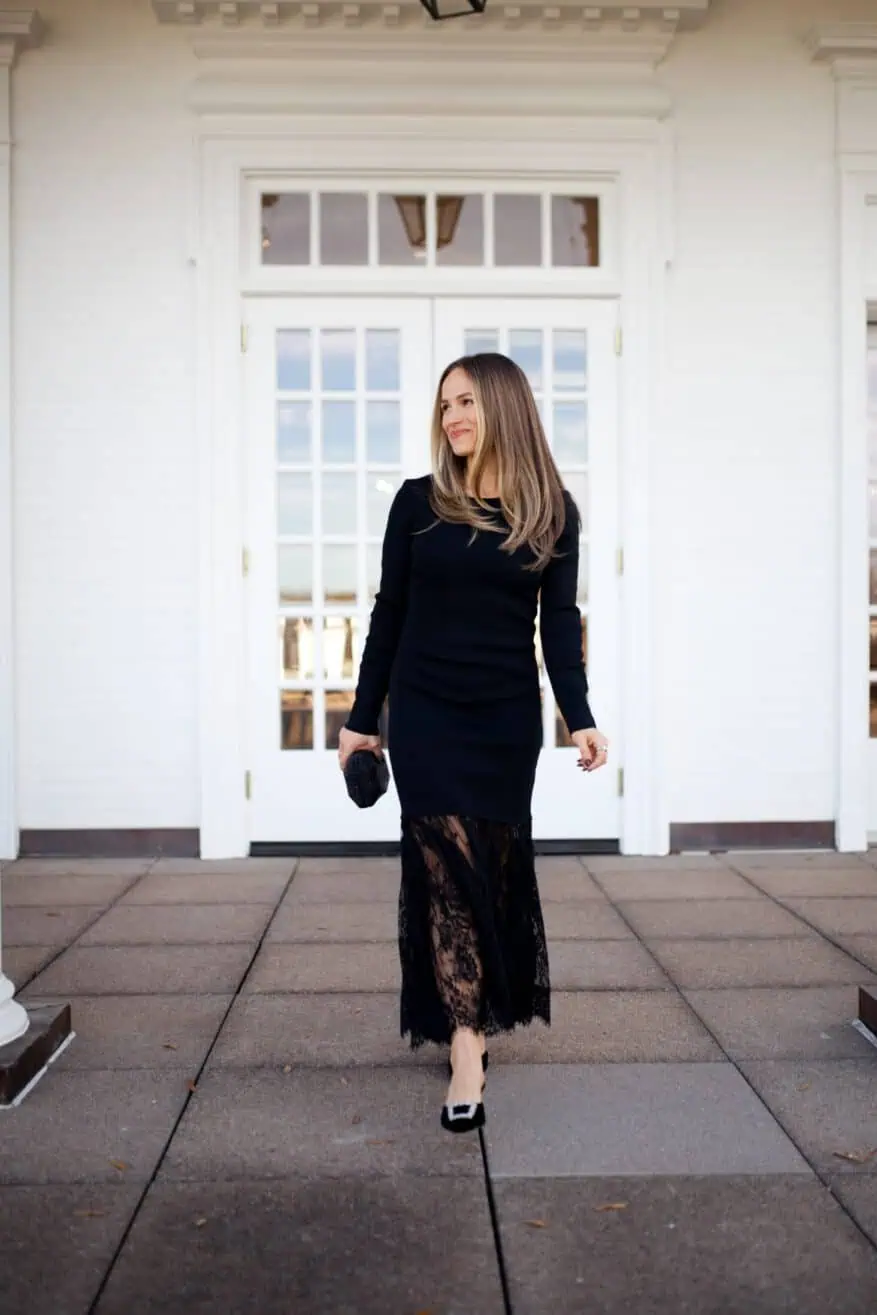 I wore this Black Knit Dress from Tuckernuck over the holidays and included it in my holiday cocktail dresses roundup this past year. It’s comfortable and unbelievably flattering. I felt like I could move around and never got sick of being in this dress. I paired it with these Sam Edelman kitten heels and a sparkly clutch like this. This is a great example of a dress that would also be considered black tie optional depending on the venue, your desired comfort level, or your preferred look!
