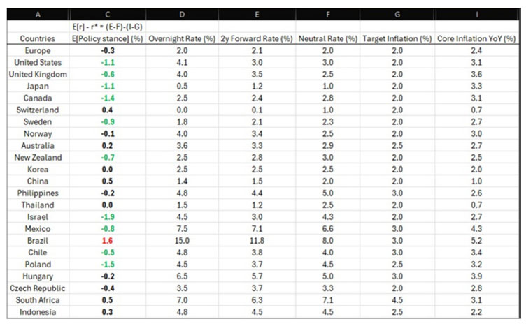 Take a look at the table below to see how many central banks are ‘neutral’ in black or loose in green. Only Brazil, in this sample, is tight.